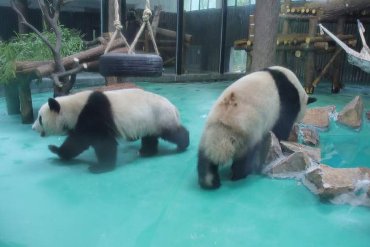 中午12点左右,两只大熊猫终于从虹桥机场抵达上海动物园,进入崭新的大熊猫馆。率先从车上下来进入展馆的是星光,随后是和风。只见两只熊猫一进新家,先慢慢兜了一圈,熟悉环境,先去水池边闻闻,再去秋千架子摸摸,一点没有紧张的样子。