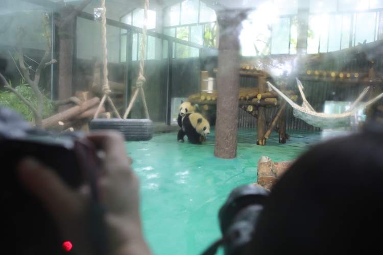 星光在展区兜了几圈之后,和风也进来了,两只熊猫迅速汇合,不久骑在对方身上,玩耍起来。成都来沪的饲养员白芙蓉让上海动物园的饲养员把小门打开,以便大熊猫可以自由进出室内外展区,"大熊猫不怕雨淋,所以就让它们自由选择喜欢待的地方。"