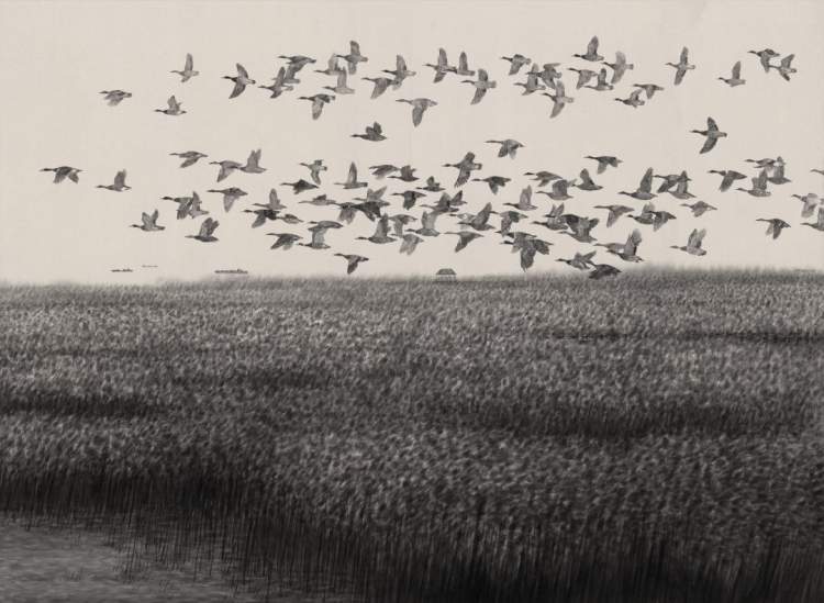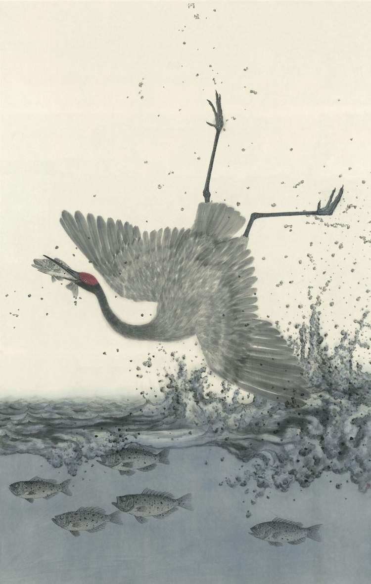作品悬挂于滔滔浦江边的C+Collection空间,在磅礴大气、满壁风动之中,又呈现鸟飞鱼翔、天空海阔的欢喜、宁静与博大。