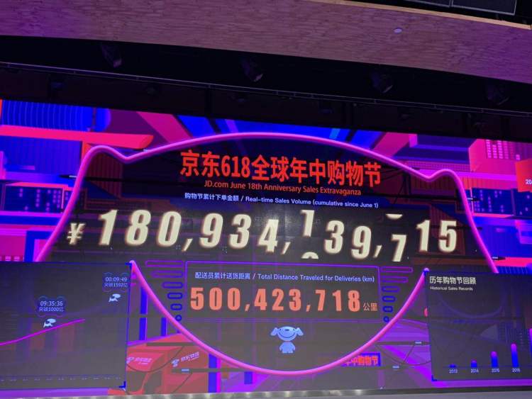 截至6月18日 24 时,京东平台累计下单金额达2015亿元,快递员累计送货距离达 5 亿公里。