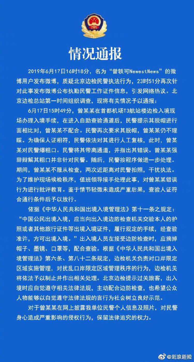 6月19日,北京边检通报了曾轶可事件: