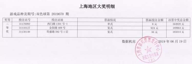 数据显示,上海中得4注二等奖,单注奖金182464元。彩票分别售出于西门路1301号-1、金阳路409号、茸盛路592号1层福彩销售点。