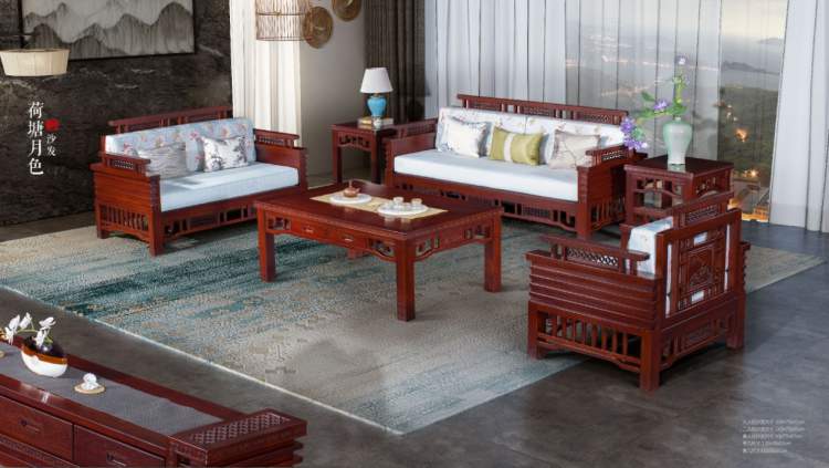 此款沙发在四角处采用的就是方形设计,既避免了原材料的过度浪费,也在视觉上给人四平八稳之感。方形的设计也更显得大气。沙发的多处采用了镂空设计,又避免了整体的笨重感,靠背处雕了荷花雕饰,象征着主人家高风亮节。在软包的配色上,用素色和淡雅的花式图案做搭配,整体上提升了作品的明亮感。