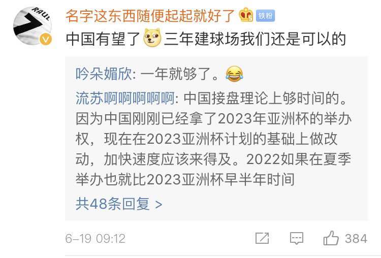 消息一出,最激动的莫过于中国网友球迷。有人表示“这盘我们接”,也有人对成为“立即能替代卡塔尔举办2022世界杯”的条件充满信心,“中国有望了,三年建球场我们还是可以的。”