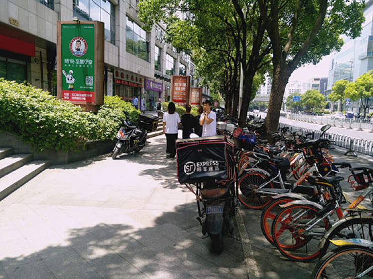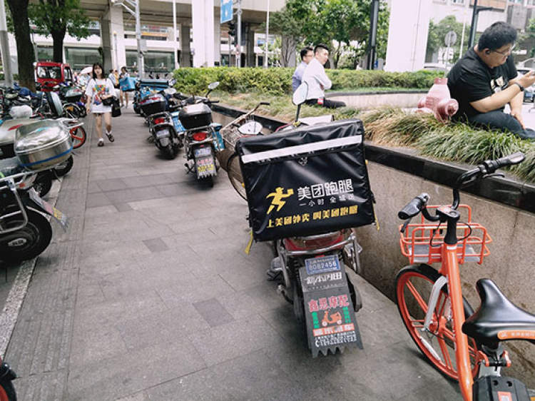 在虹口龙之梦后门同煌路沿街上,一边是排放整齐的非机动车,一边却是随意乱停的非机动车,尤其是中午送餐高峰时段,各种送餐车乱停放现象尤为严重。