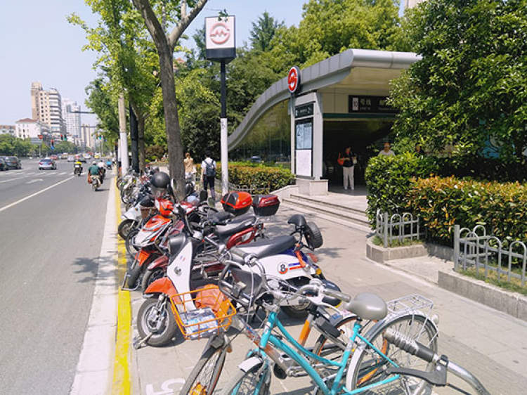在四平路上的地铁10号线邮电新村站,非机动车摆放井井有条,也没有见到执勤人员驻守,骑车人都比较自觉守规矩。
