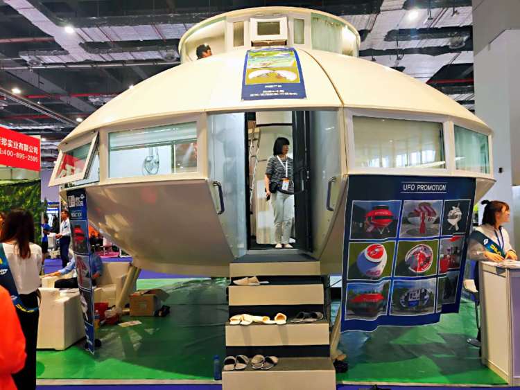 在房车露营展区,19个知名房车品牌,70辆房车齐亮相。其中,深圳市亚通桥科技开发有限公司直接将全新概念的UFO型别墅搬到了现场,吸引了众多观众前来一探究竟。