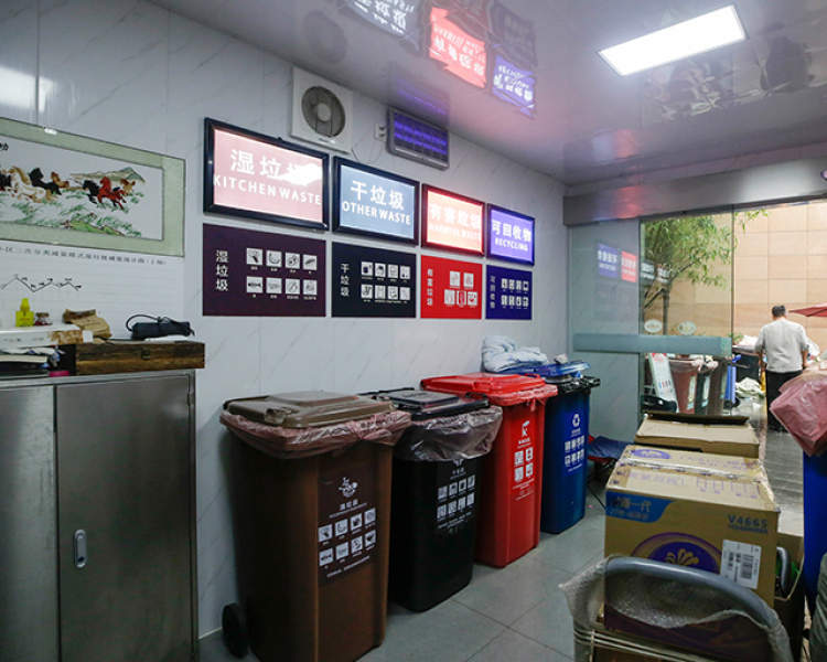 中午12点半,张先生拎着一袋厨余垃圾,来到小区一角的垃圾箱前,把袋里的剩饭剩菜倒进湿垃圾桶里,又把塑料袋抖了抖,抖干净后,再把这只空塑料袋放进干垃圾桶里。张先生离开垃圾桶时,抬起手,觉得有点脏,就回到垃圾桶边的水槽前,打开水龙头,将手洗一洗。水槽上还有肥皂和洗手液,很齐全。在张先生身后,是小区里的的“生活垃圾减量房,里面一溜摆着8只垃圾桶。墙上的空调开着,显示屏上显示温度为16℃。”