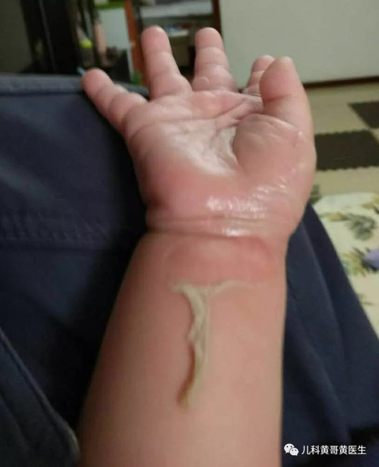 童童被热米线烫伤了,总烫伤面积有半个巴掌那个大,又红又肿。