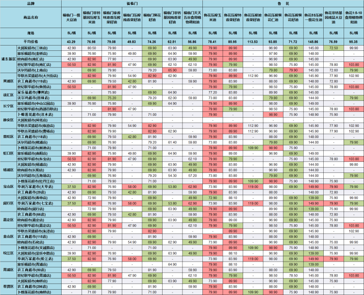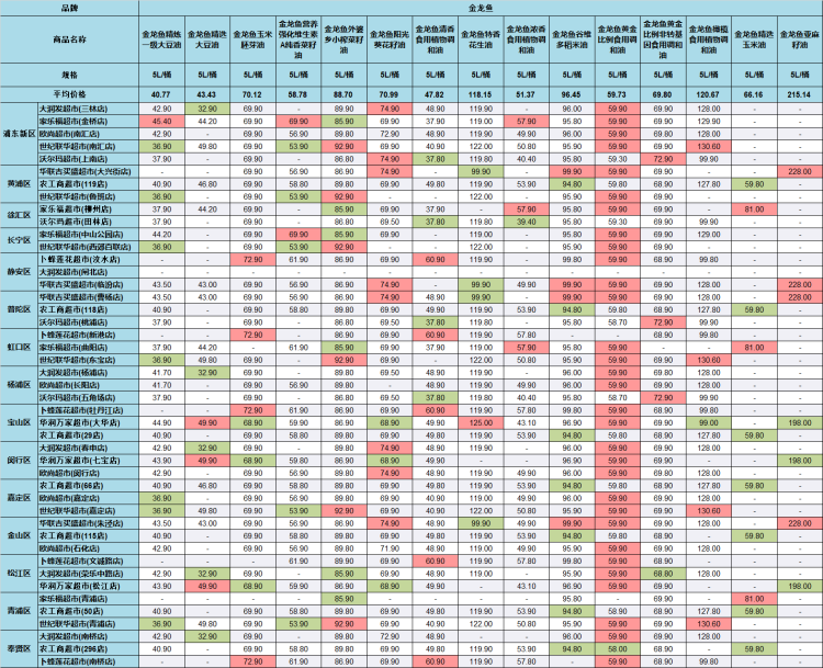 市价监成调队昨日公布了沪上45家超市部分食用油的价格,包括金龙鱼、福临门、鲁花、海狮和多力5个品牌。