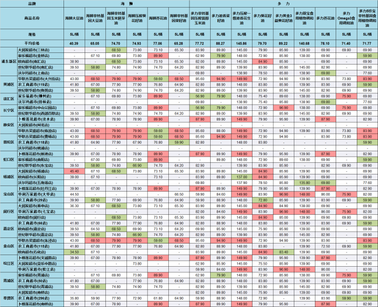 值得关注的是,监测到的食用油最大价差为31.60元。品名为金龙鱼橄榄食用植物调和油(5L/桶)在世纪联华超市南汇店、东宝店、嘉定店、青浦店售价为130.60元,而华润万家超市大华店售价竟为99.00元,两者相差31.60元。