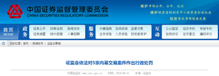 据中国证监会网站,证监会依法对5宗内幕交易案件作出行政处罚。
