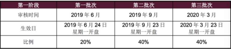 A股纳入富时指数将基于陆股通部分,共分三批次进行,分别在2019年6月、9月和2020年3月,进度为20%、40%、40%,三步实施完毕后,A股将完成按照可投资部分的25%比例纳入;也就是说,这三步实施后,A股纳入比例将分别为可投资部分的5%、15%、25%。这三步统称为第一阶段。