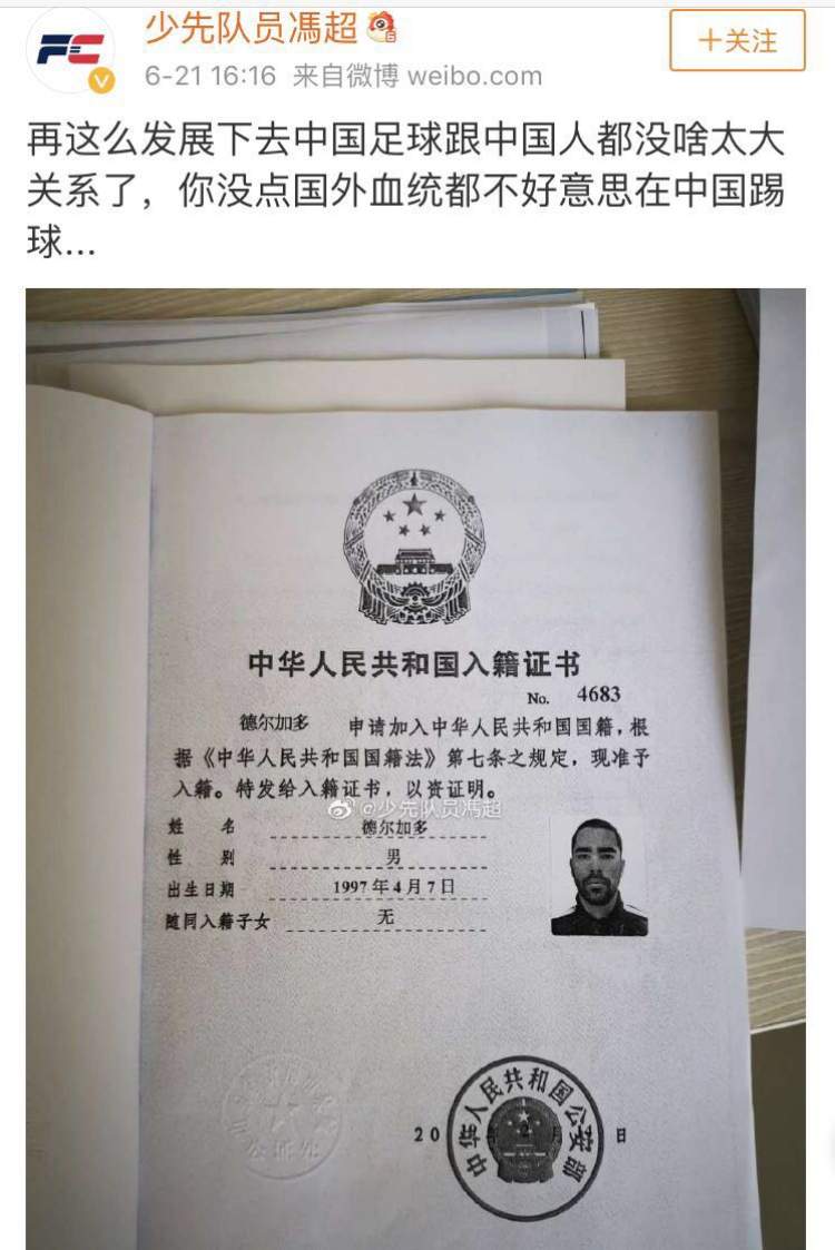 今天下午16:16分,新浪微博认证为“体育博主 体育视频自媒体”的网友“少先队员馮超”在微博上晒出山东鲁能球员德尔加多入籍中国的证书,继北京国安的李可、侯永永之后,德尔加多成为又一个归化球员?如果是真的,德尔加多成为第一例非华裔的归化球员。