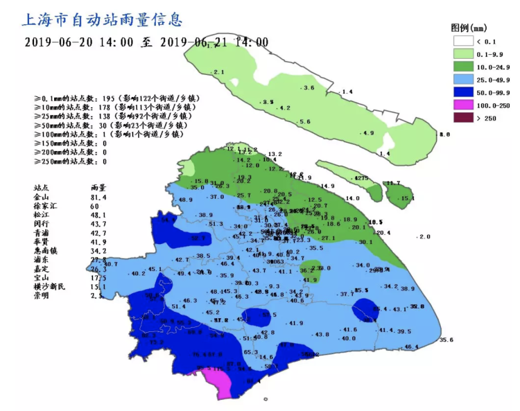 昨天14时到今天14时的24个小时内,国家级气象站中累计雨量最大的是金山的81.4℃,其次是徐家汇站点的60毫米。