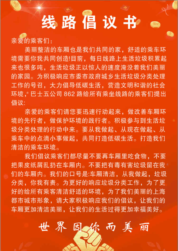 在车队的带领下,862路职工在路线上推行了一系列为民服务的措施:为了提供老年乘客的安全出行方便,倡导对老人上下车扶一扶,在车厢里挂上了“敬老服务友情提醒”“敬老特色服务承诺”等宣传牌;针对862路早高峰学生乘客多的特点,为学生增加的班次的特色一直保持到现在。