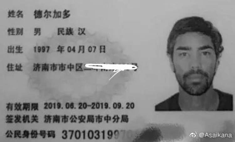 随后,网络上还曝出了德尔加多的临时身份证。根据微博认证为“德国转会市场网站(TransferMarkt)中国区管理员”的“Asaikana”贴出的德尔加多临时身份证照片,这名鲁能归化球员中文名字依然是“德尔加多”,民族则为“汉”,临时身份证的有效期从2019年6月20日-2019年9月20日。