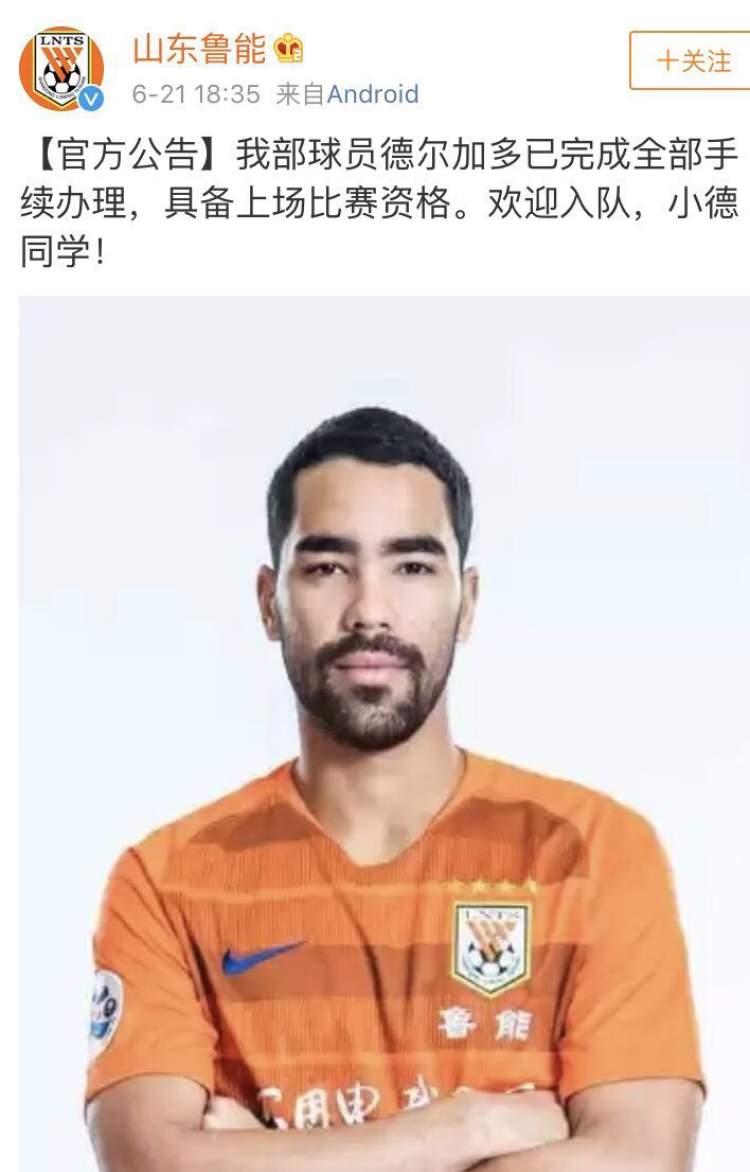 今天晚上18:35,鲁能俱乐部官方微博终于实锤:“【官方公告】我部球员德尔加多已完成全部手续办理,具备上场比赛资格。欢迎入队,小德同学!”