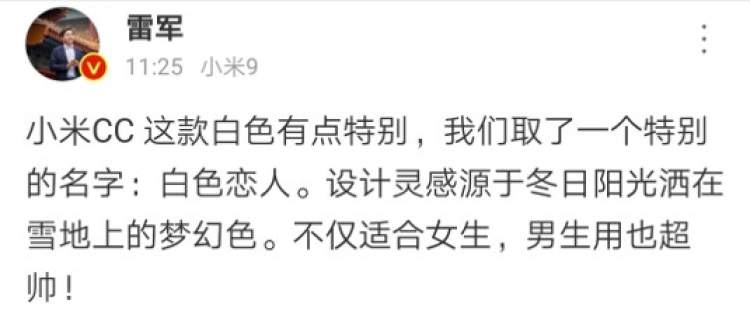 6月26日,雷军今日公布了小米CC9白色版的取名“白色恋人”。他表示设计师灵感来源于冬日阳光洒在地上的梦幻色。