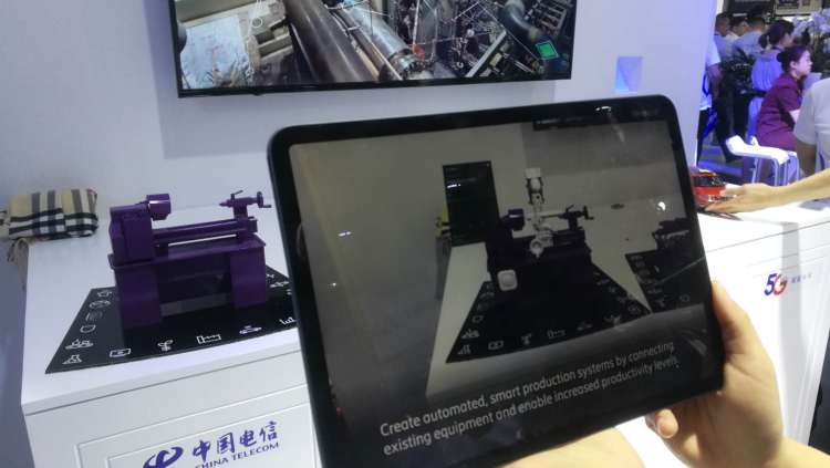 在中国电信展区5G+AR智慧制造展台,工作人员正拿着一台平板电脑扫描桌上的各种机器设备。只见这些机器设备被摄像头照进屏幕后,瞬间便在屏幕中“活”了起来——有的正在自我解剖,有的正在被其它虚拟机器拆解。