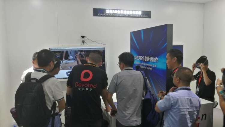 走近一看,两位体验者头上都带着AR眼镜,手上都握着手柄。一旁的工作人员告知,他们正在进行一场5G+AR全息通话。记者体验发现,通过这个5G+AR全息通话协作系统,通话者可以同时处于同一个场景中,并通过手柄来改变场景中的各种物体,例如移动物体的位置等。