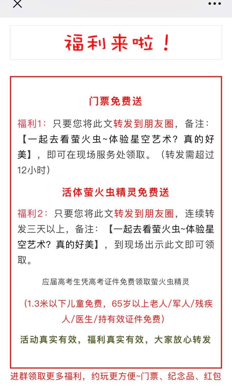 近期,某微信公众号上出现了周浦花海将举办首届萤火虫星空展的消息。文章介绍,此次大型萤火虫放飞活动将持续到8月,所有萤火虫都是人工繁殖,并不是野外捕捉。将消息转发朋友圈,即可免费获得门票,连续转发3天以上,还能获赠活体萤火虫。如果不转发朋友圈,门票40元。