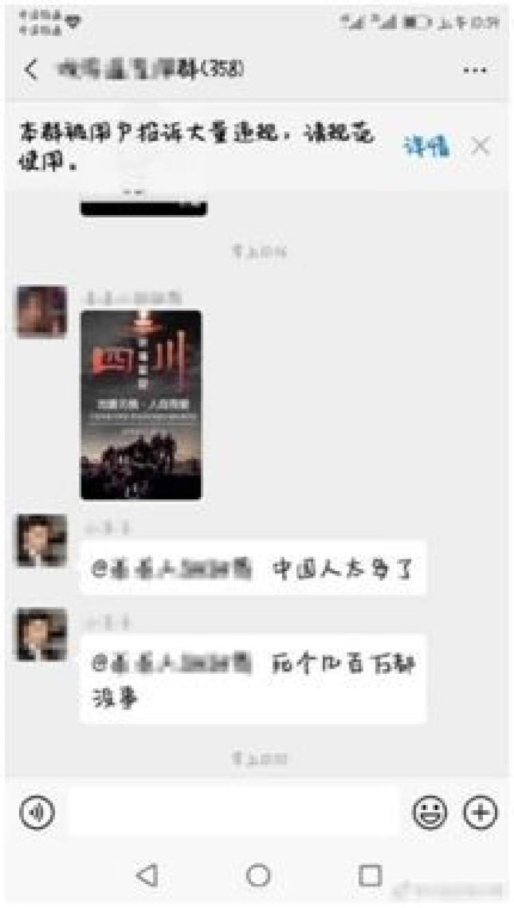 近日,“上海网警”官方微博账号接到网民举报,一网民在微信群内发布涉及四川宜宾地震中逝者的侮辱性言论。