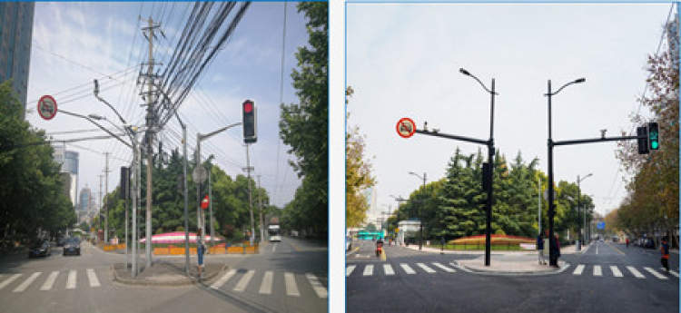 去年夏天起,市民们发现,许多路段杂乱的架空线消失了,走几步就不得不绕行的各种杆子也被陆续拔掉了,绿树掩映的林荫马路也不再被或白或灰的“大挑臂”争夺眼球,取而代之的是简洁低调的综合杆。