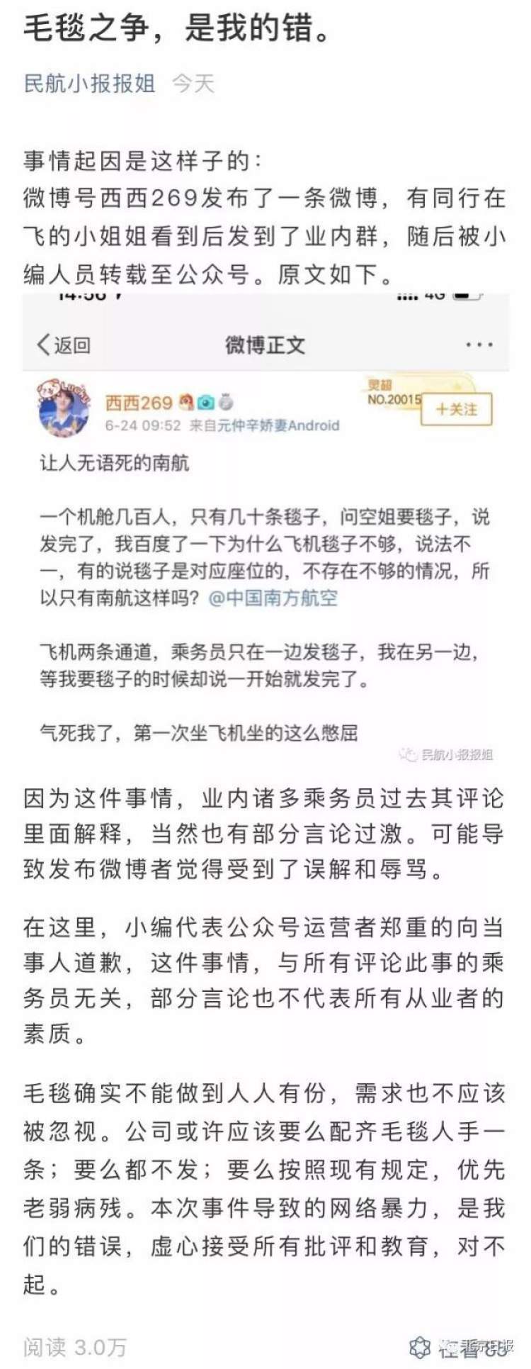 6月26日,微信公众号“民航小报报姐”发文《毛毯之争,是我的错》,向网友@西西269 道歉。文中称,