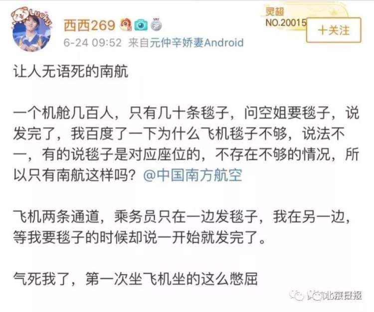 6月24日9时52分,网友@西西269 发微博抱怨自己坐的南航一客机里毛毯过少,并艾特了南方航空公司 。