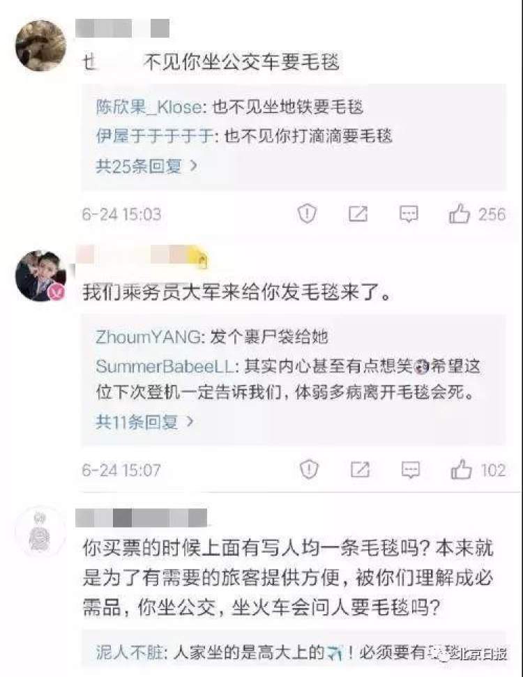 近日,网友发微博称坐飞机太冷但没拿到毛毯,于是抱怨飞机上毛毯少,却引来无数辱骂讽刺,其中包括民航从业人员的冷嘲热讽,事情经过大致是这样的: