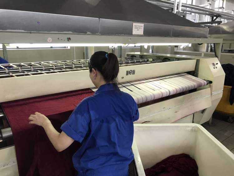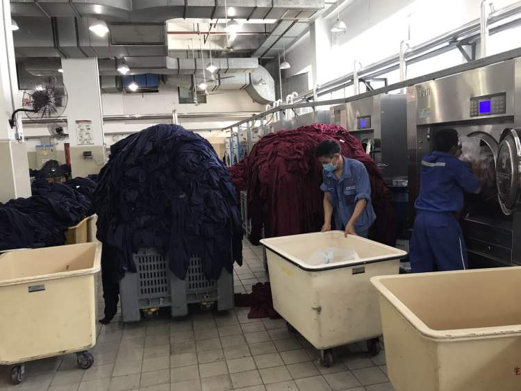 除了熨烫之外,车间内的工作人员还交替进行着清洗毛毯,分拣和整理枕芯、枕套等工作。机器同时洗涤300条毛毯所花费的时间在40分钟左右,然后再进行25分钟左右的烘干,但是一旦发现毛毯上有口香糖,粘纸,就要用特殊的干洗机器和药水先进行处理,再进行后续的工序。这样又要多洗40分钟了。