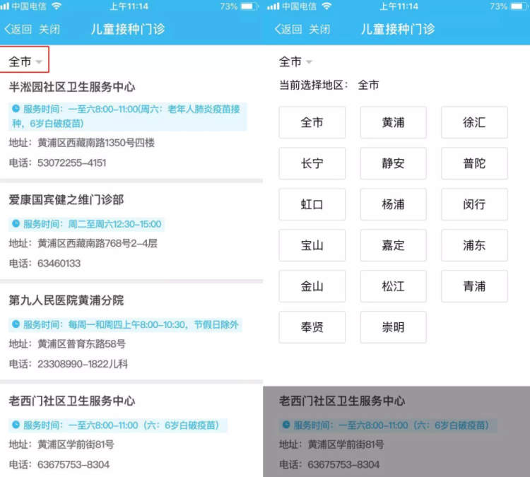 “接种站点”显示全市提供儿童接种的门诊地址、电话,家长们可以按区查询。
