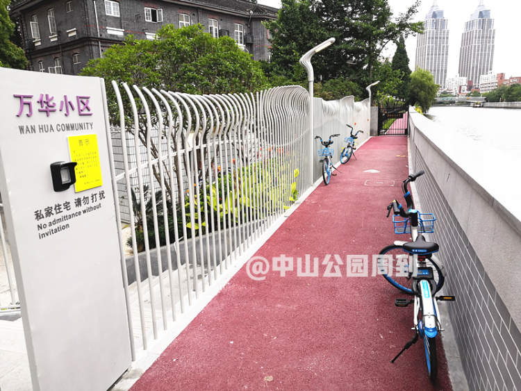 不过,杉杉也发现了不和谐的一幕,苏州河健身步道是禁止非机动车通行的,但在万华小区出口处,杉杉却发现了3辆共享单车停放着。