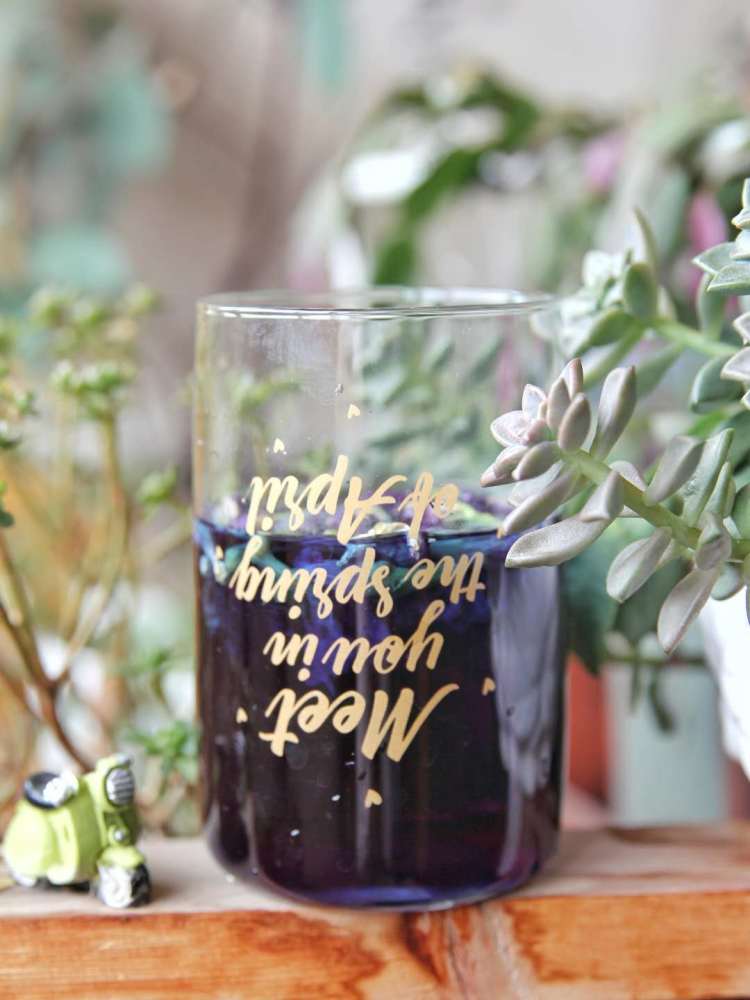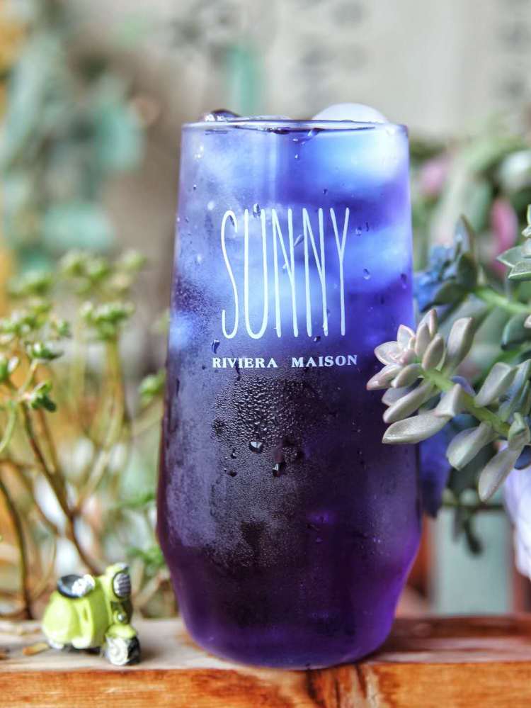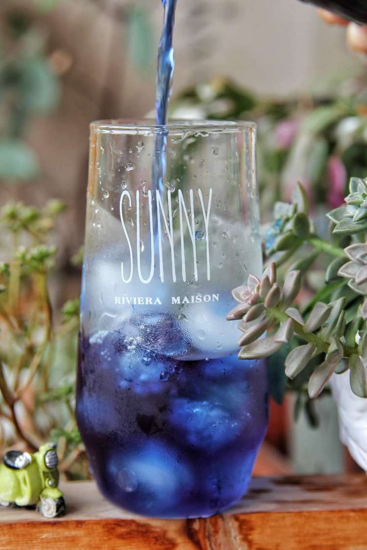 3、将冷却后的蝶豆花水,倒入冰杯至7分满。