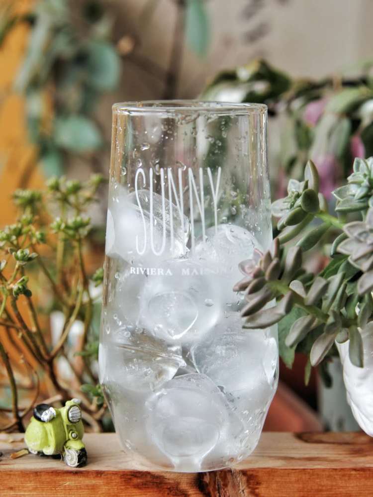 2、提前自制冰块,将冰块放入长条形的杯子,8分满即可,可以选择自己喜欢的杯子。