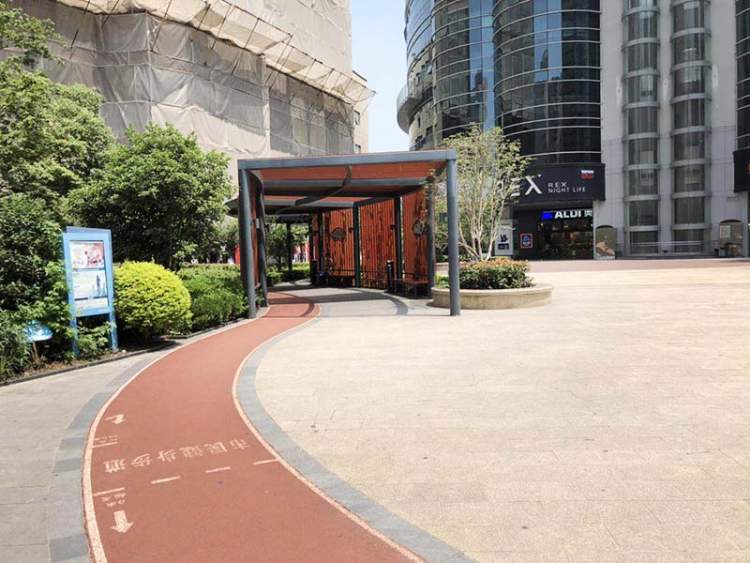 接着,周到君又来到了静安区运动健身中心南广场。步道地址显示是康定路151号,但实际位置更接近江宁路武定路口。此处健身步道整体呈环形,步道沿着南广场绕了一圈。