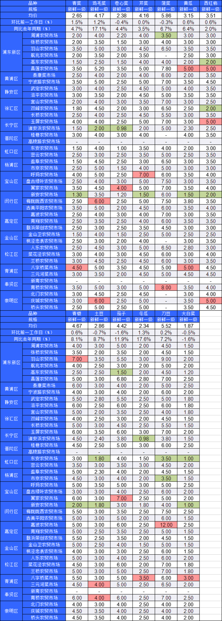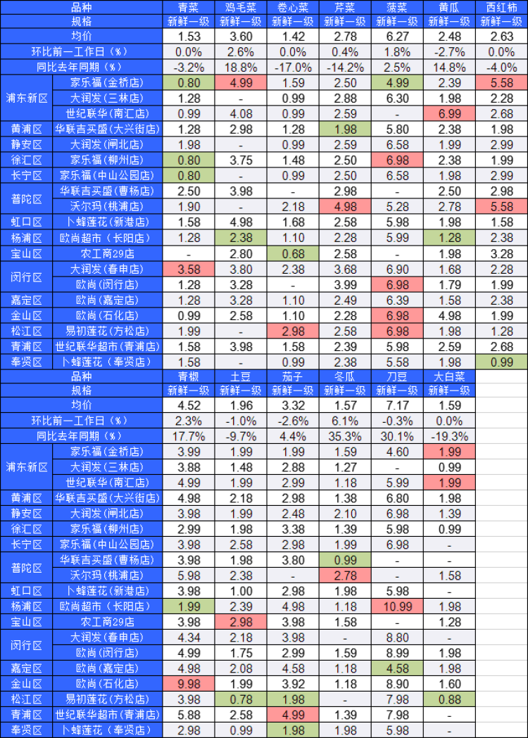 ■粉底标注代表该蔬菜品种在上述农贸市场或超市的最高价;绿底标注代表该蔬菜品种在上述农贸市场或超市的最低价