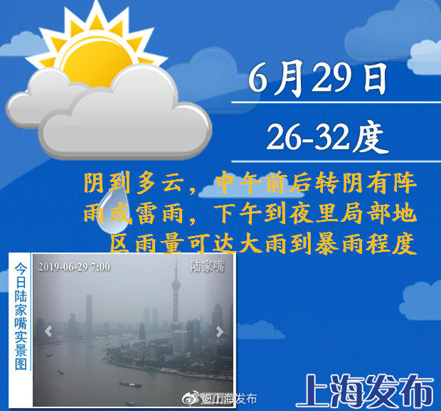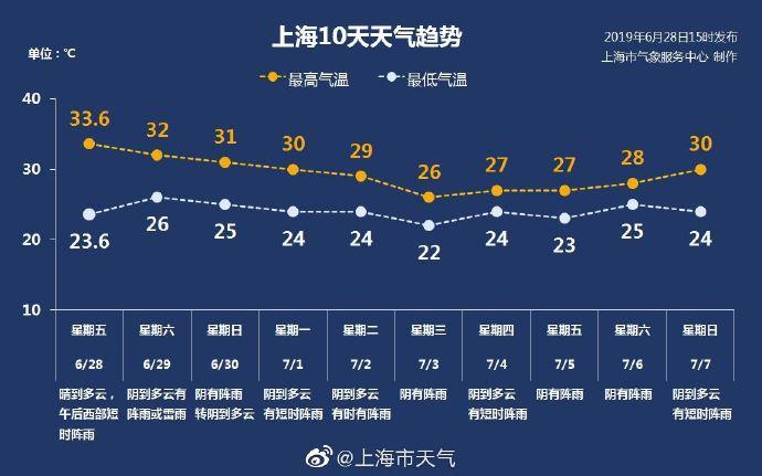 预计下周,梅雨带在江淮到江南北部一带摆动,受其影响,上海仍多降水过程。有云有雨有阳光,气温较前期略有升高,最低气温普遍在24℃上下,最高气温在26~30℃之间。