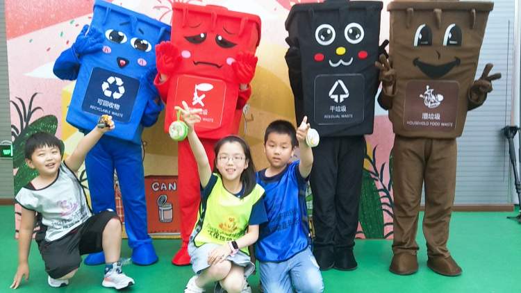 值得一提的是,主办方不仅设置了好玩有趣的游戏,还请来了四个人形玩偶垃圾桶,分别是干垃圾、湿垃圾、可回收物、有害垃圾。主办方工作人员告诉周到君,人们总是觉得垃圾桶又脏又丑,这次设置人形垃圾桶,就是想让小孩子与大人们对垃圾桶产生亲近感,让他们觉得垃圾分类就是一种“新时尚”。