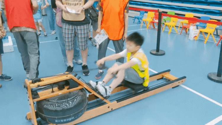 环保小铁三是最“火”的项目,现场排起了长长的队伍。这个游戏需要一家三口完成,家长A低碳出行——骑200米动感单车,家长B珍惜水资源——陆地皮划艇200米,小朋友垃圾分类PLOGGING跑10米,在终点处识别垃圾卡片,并扔进对应的微型垃圾桶,完成全部任务,即可获得奖章一枚。