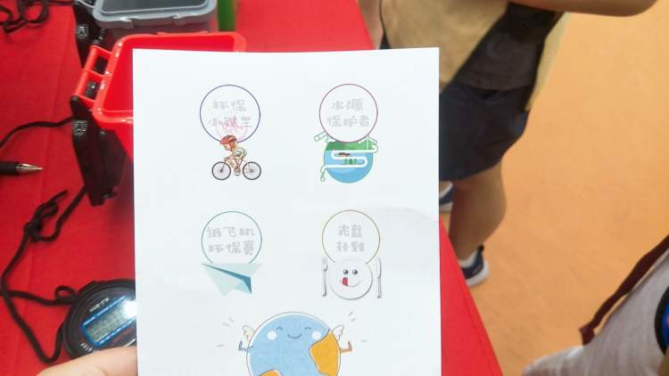 当日现场设有环保小铁三、环保纸飞机、水源保护者、光盘计划等体验项目。体验项目策划人告诉周到君,每一个小游戏都会结合场地大小、亲子参与度等综合因素考虑,力求让孩子和家长玩得开心,在畅玩里一起讨论垃圾分类。