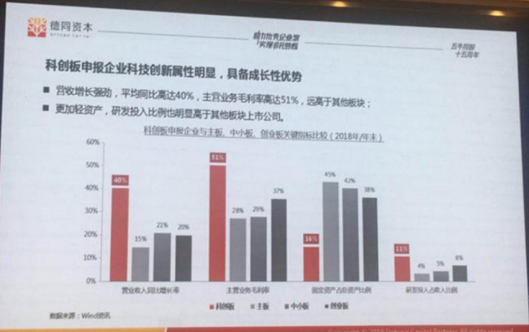 目前已经有141家企业申报了科创板,在日前沪上举办的五牛控股十五周年发展报告暨媒体研讨会上,德同资本董事长邵俊认为,这些企业体现了科创板的特色。与主板、中小板、创业板上市企业相比,科创板申报企业体现出“三高一低”的特色。“三高”指收入增长率高、主营利润率高、研发投资占收入的比例高。邵俊说,科创板申报企业平均毛利率超过50%,远高于其它三个板块的平均毛利率。