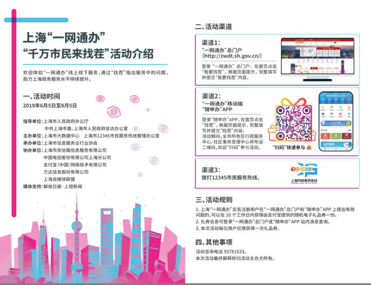 目前,市民仍可以登录“随申办”APP,或者拨打“12345”市民服务热线,提出宝贵意见建议。此外,市民可以在全市300多个区级行政服务中心和社区事务受理中心,以及市人才服务市场、市公安出入境管理局等10个市级行政服务大厅看到相关活动海报,志愿者还可以手把手指导市民使用“一网通办”的各项服务。