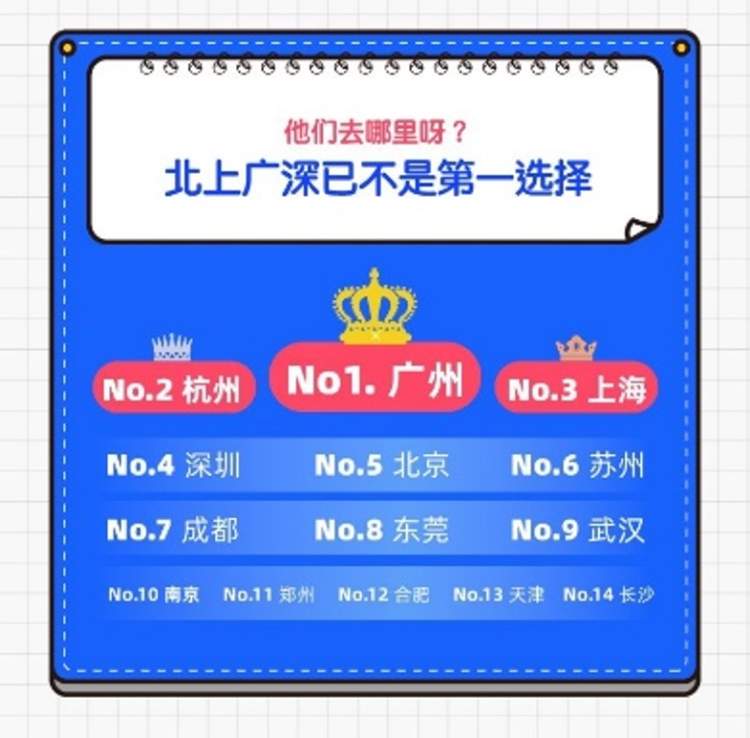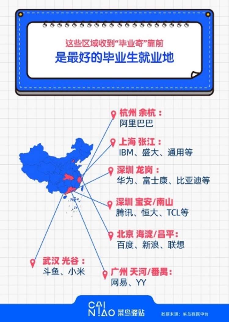 菜鸟驿站数据显示,广州、杭州、上海、深圳、北京成为寄送快件前五的目的地。此外,苏州、成都、东莞、南京、郑州等新一线城市均成为了毕业生的热门择业地。