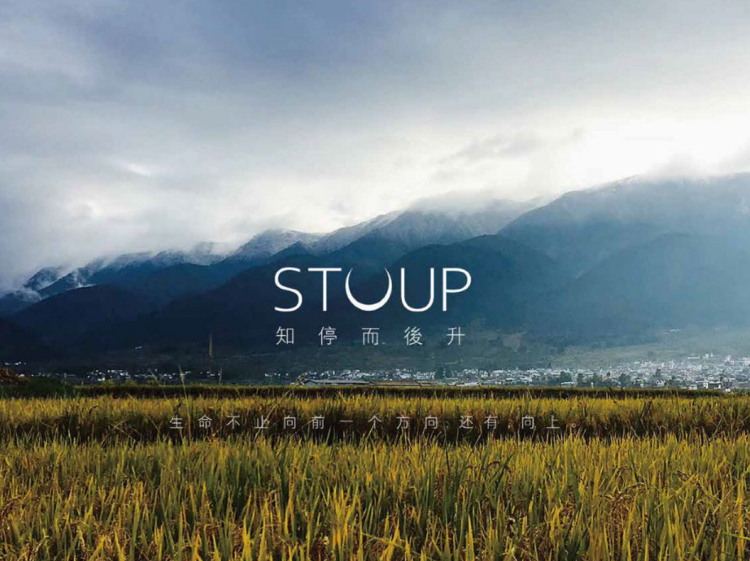 这5个字被他放在了一张凤羽旷远的照片上,如何解释?封新城在下方给出了一行阐释:生命不止向前一个方向,还有,向上。他用stop+up组合成了一个新词stoup,用来形容“知停而后升”再恰当不过。