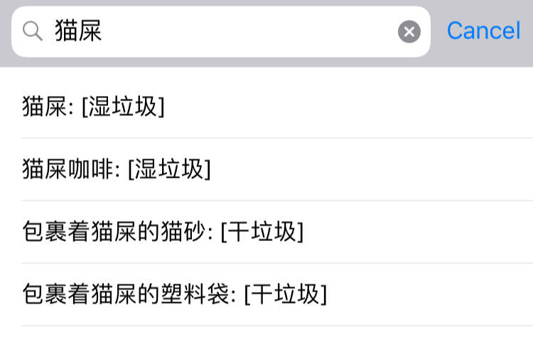 例如,在官方平台输入“猫屎”,立即跳出“您查找的垃圾不属于日常生活垃圾”的提示,同样在垃圾分类助手APP中输入“猫屎”,也会跳出“猫屎是未知垃圾”的提示。