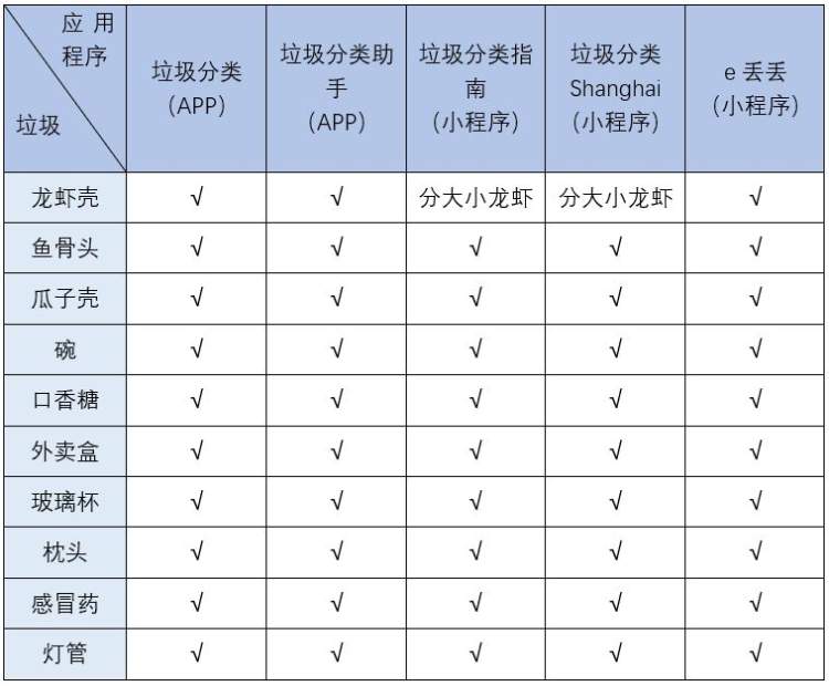 通过表格可见,除了“垃圾分类指南”、“垃圾分类Shanghai”两款小程序对龙虾壳这一垃圾的查询结果与官方平台不一致外,5款应用程序显示的10种垃圾的类别基本都与官方平台一致。也就是说,5款应用程序的查询准确率均接近100%。