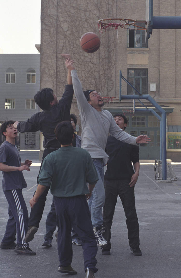 ■2002年赖声川在中戏操场与刘烨(右一)、翟小兴、唐旭等学生打篮球