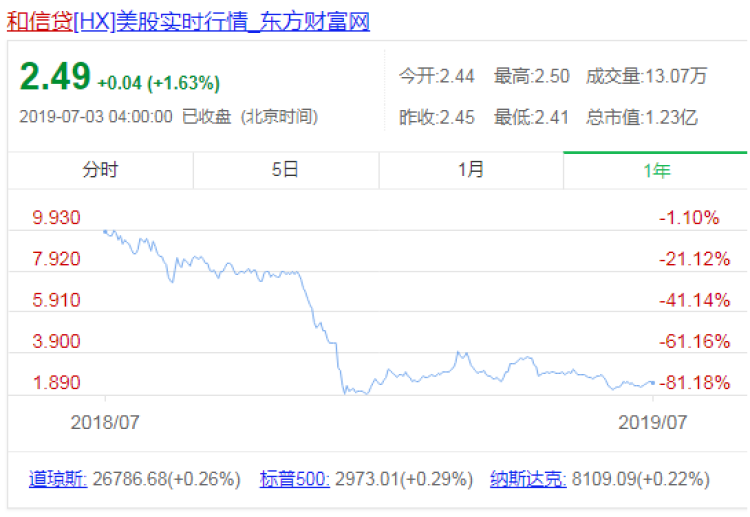 对于和信贷来说,现在的业绩已经不足以满足投资人的预期,6月18日,和信贷发布的截至2019年3月31日的2019财年第四季度及全年业绩显示, 虽然第四季度促成借款总额和净收入虽然双双环比翻番,不过其余数据和往年同期相比,净营收为415万美元,同比下降85.0%。净利润为285万美元,同比下降83.3%。公布财报当天,和信贷股票当日跌幅达到7.99%。